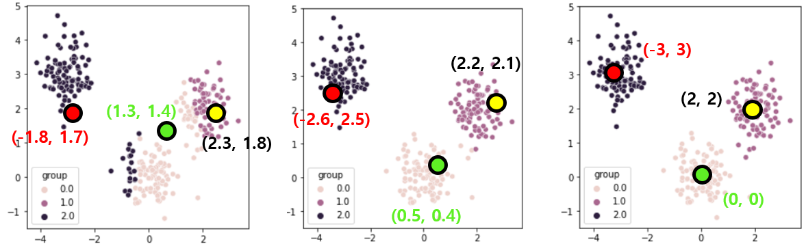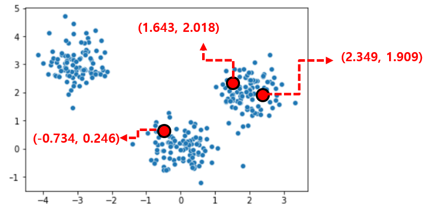그다음, 이렇게 랜덤하게 세 개의 점으로 중심점들을 선언해 줍니다.