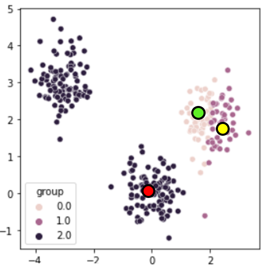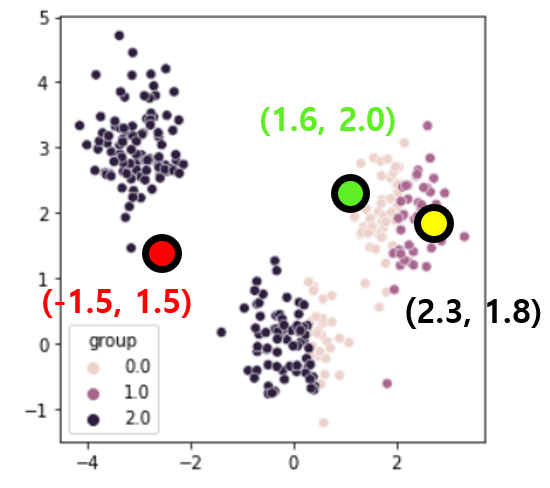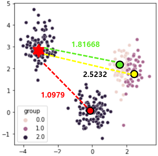 빨간 점까지의 거리가 1.0979로 가장 짧아 검은색 클러스터에 포함된 것을 볼 수 있습니다.