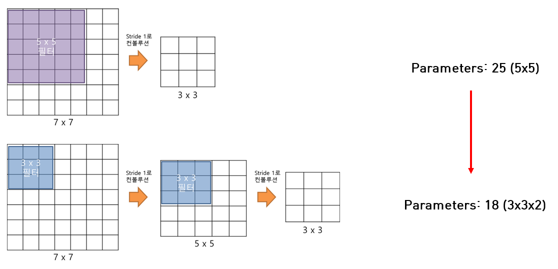 반면 3x3 필터로 2회 연산을 수행하는 데 필요한 파라미터 개수는 18개입니다.
