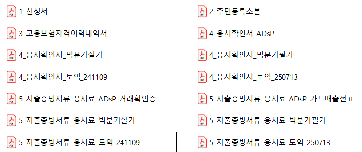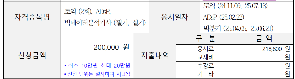 그래서 저는 토익, ADsP(데이터분석준전문가), 빅데이터분석기사(실기, 필기) 응시료 지원을 신청했습니다.
