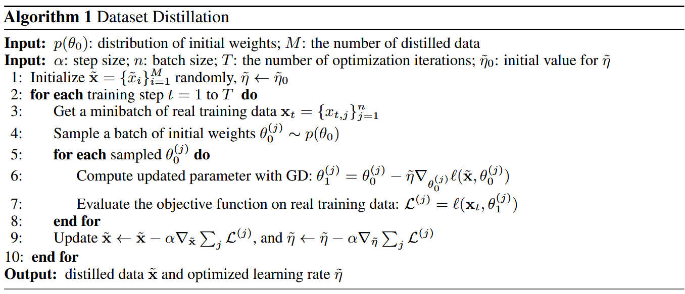 - 원본 데이터의 정보를 압축하여 몇 번의 GD step만으로 모델을 빠르게 학습시킬 수 있는 distilled images 생성 방법론, 즉 dataset distillation을 제안함. 알고리즘은 모델 weight 대신 distilled images 픽셀 값을 최적화하는 방식으로 동작함.