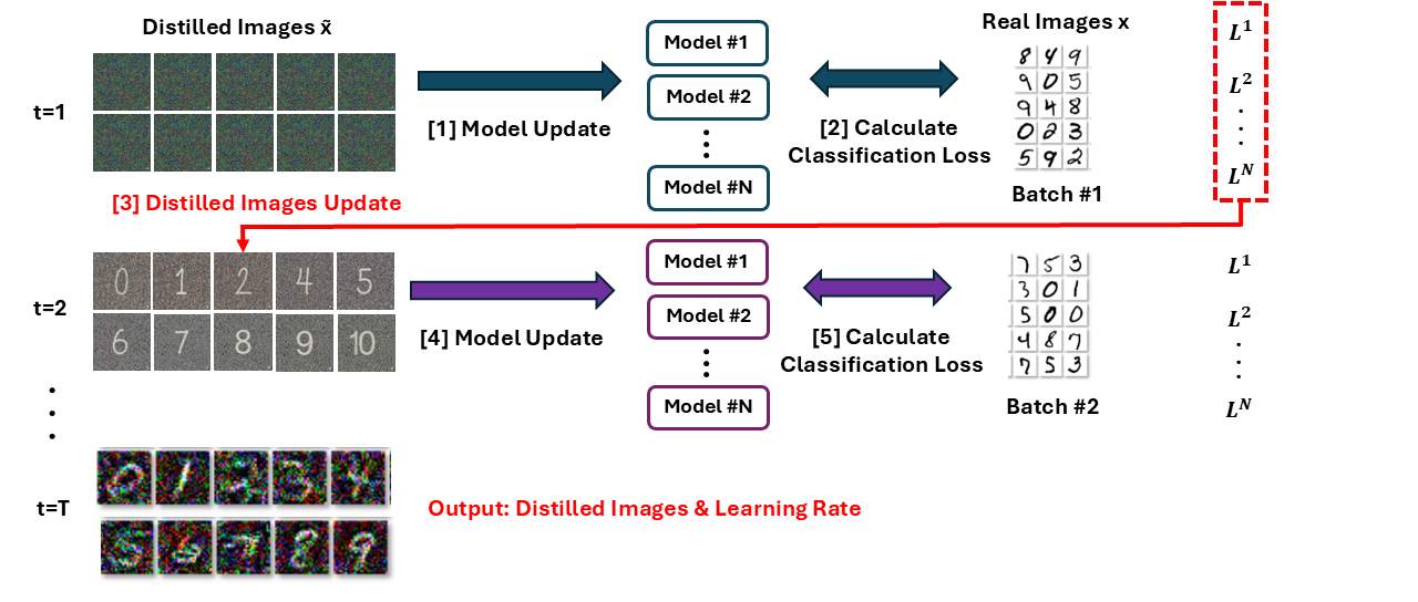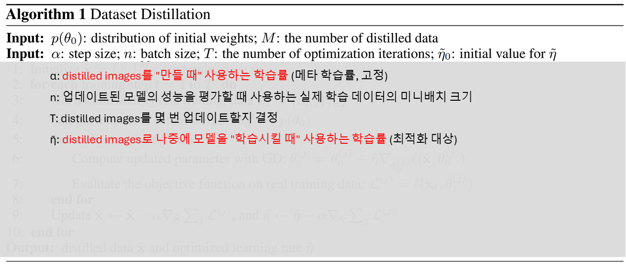 앞서 소개드린 과정에서는 (Line 6) 증류 데이터 x̃ 하나로 한 번만 업데이트 & 학습률 η̃ 하나만 최적화하죠.