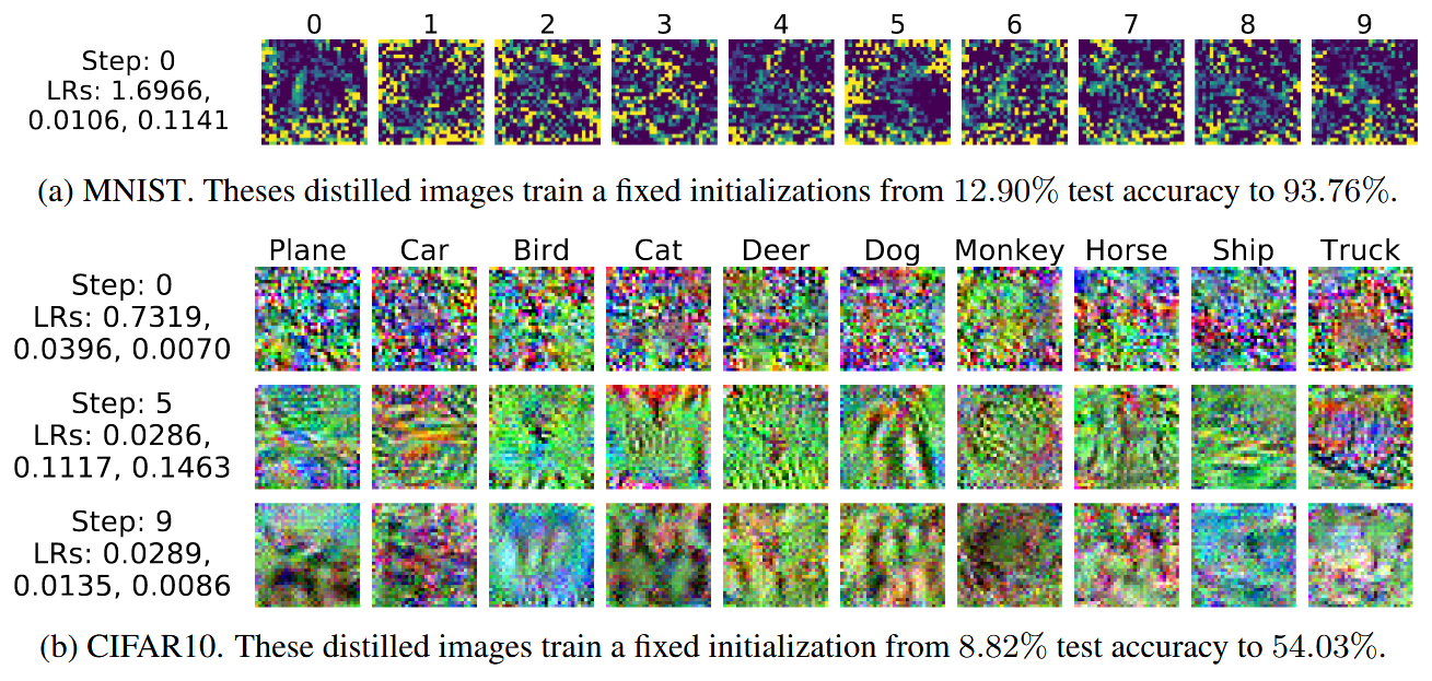 Fixed initialization 설정에서 MNIST는 10장의 증류 이미지로 12.90%에서 93.76%로, CIFAR10은 100장으로 8.82%에서 54.03%로 성능이 향상됩니다.