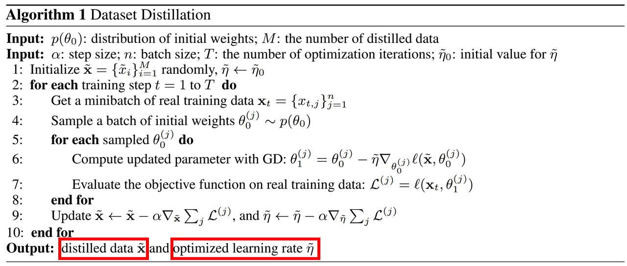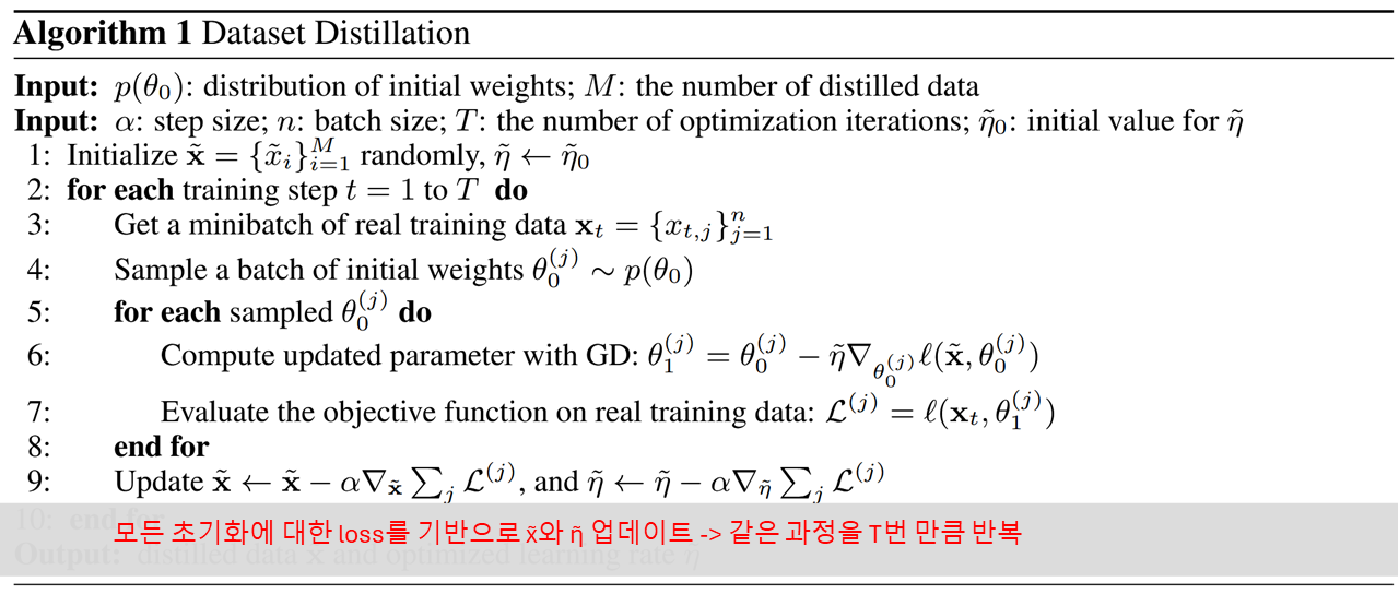 - Line 6: 여러 증류 데이터 x̃₀, x̃₁, ..., x̃₉로 순차적으로 10번 업데이트