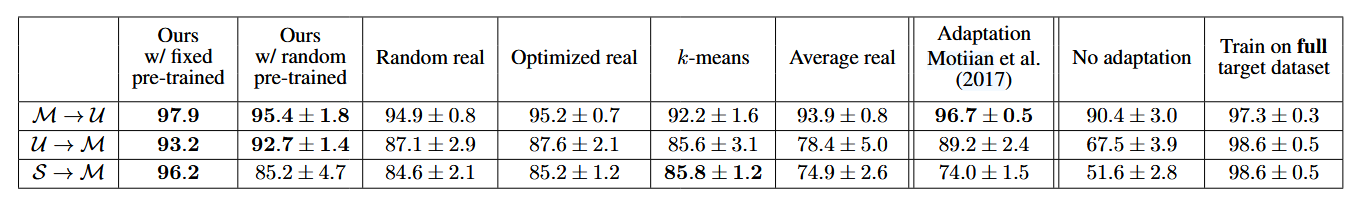 Table 2는 세 가지 숫자 데이터셋(MNIST, USPS, SVHN) 간의 도메인 적응 성능을 비교합니다.