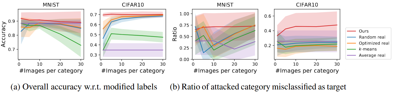 기존 data poisoning은 잘못된 데이터를 학습 데이터에 저장하고 여러 에포크 반복 학습시켜야 했는데, 반면 이 논문의 방식은 distilled images를 사용하면 단 한 번의 경사하강법 스텝만으로 특정 클래스를 오분류하도록 모델을 망가뜨릴 수 있다고 주장합니다.