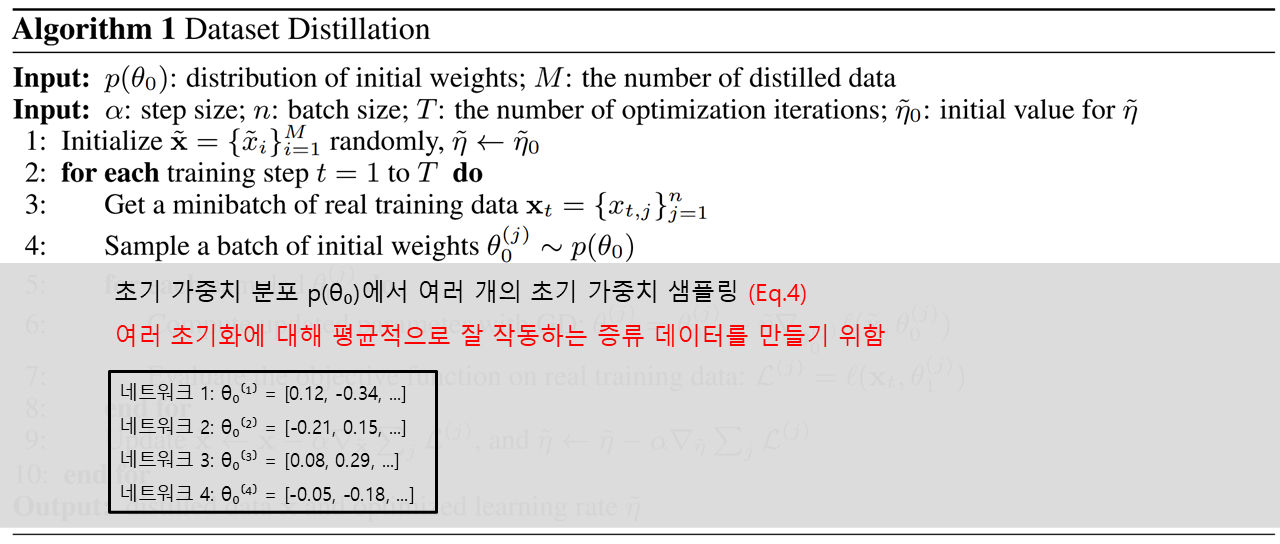 이를 해결하기 위해 논문에서는 같은 분포(Xavier 초기화)에서 여러 가중치를 샘플링한 후, 이들에 대한 평균 손실을 최소화하도록 distilled images를 최적화하는 방법을 제안합니다.