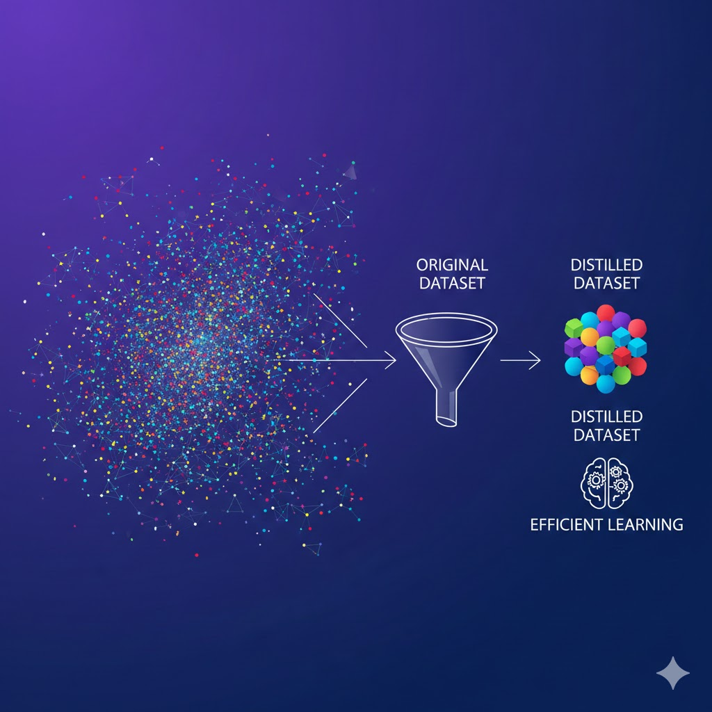 - Dataset Distillation: 대규모 데이터셋 → 소수의 합성 이미지로 지식 압축